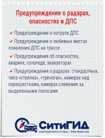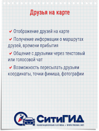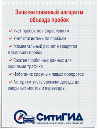 Одним из самых значительных преимуществ CityGuide является его патентованный алгоритм "Jams-2", который учитывает направление движения и скорость движения транспорта при расчете маршрута. Если данные о трафике недоступны, вместо них используются статистические данные. Кроме того, пользователи CityGuide получают голосовые и визуальные предупреждения о различных текущих событиях на маршруте, таких как полиция, опасные участки, камеры скорости, дорожные происшествия, плохие дороги и пробки. Приложение также предоставляет предупреждение о известных стационарных и портативных камерах скорости, и вы можете использовать его для отслеживания движений ваших друзей, отправки им сообщений, оставления комментариев и планирования поездок вместе.